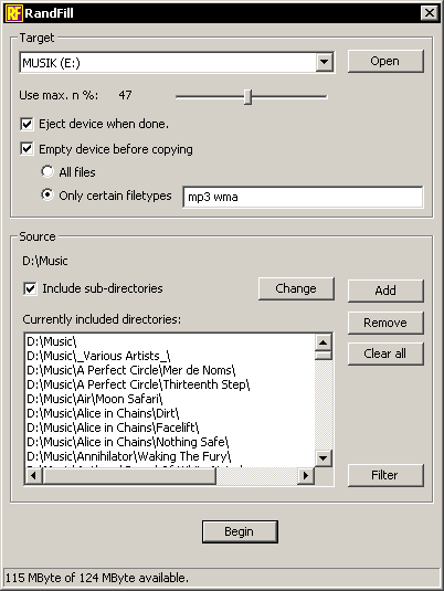 An utility program for copying files in random order onto a removable (USB) mass storage device; written for the purpose of filling a portable MP3 player with randomly chosen files from my music archive.
